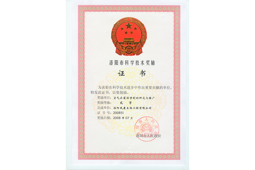 洛陽市科學(xué)技術(shù)獎(jiǎng)勵(lì)證書
